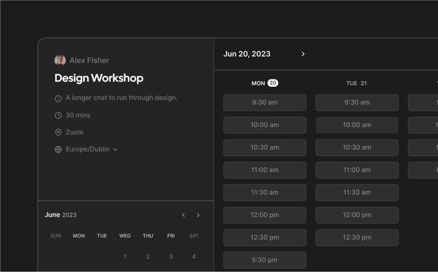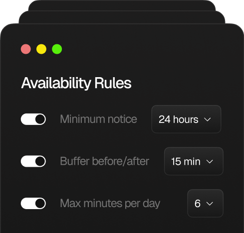 Powerful availability rules, buffers, limits, and conflict prevention so your calendar works on your terms—not everyone else's.