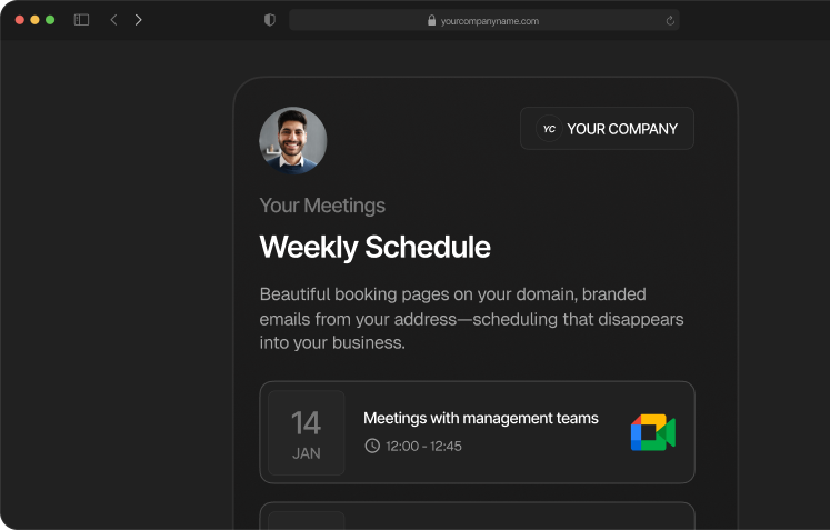 White-label scheduling that lives on your domain, sends emails from your address, and stays invisible to your customers.