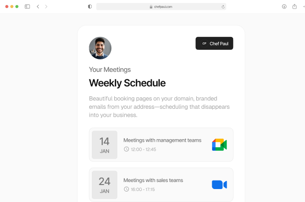 Beautiful booking pages on your domain, branded emails from your address scheduling that disappears into your business.